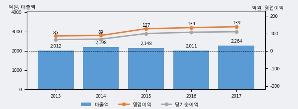 최근 실적을 살펴보면 2017년 매출액이 최근 5년 중 가장 높은 실적을 기록했음을 알 수 있다. 이전 최고 실적이었던 2014년 보다도 3.0%(66억원) 늘어난 것으로 나타났다.