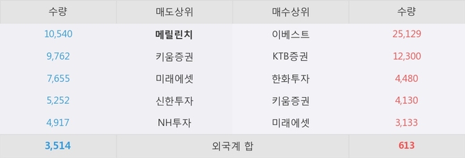 이 시각 주요 거래원은 미래에셋, 이베스트, KTB증권 등이 매수 상위 창구에 자리하고 있다. 한편, 매도 창구 상위에는 메릴린치가 눈에 띄고 있다.