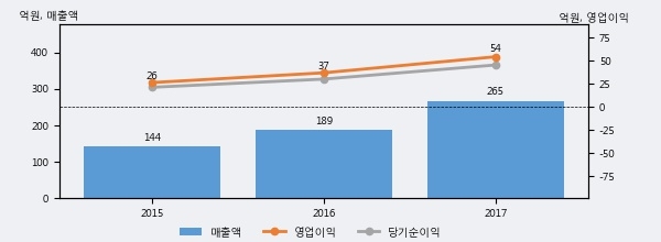 최근 실적을 살펴보면 2017년 매출액이 최근 3년 중 가장 높은 실적을 기록했음을 알 수 있다. 이전 최고 실적이었던 2016년 보다도 40.5%(76억 5천만원) 늘어난 것으로 나타났다.