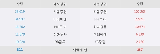거래원 동향은 NH투자, 하나금융, 미래에셋 등이 매수 상위 목록에 나타나고 있다.