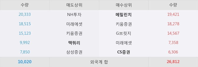 거래원 동향은 메릴린치, CS증권, 미래에셋 등이 매수 상위 목록에 위치하고 있다. 한편, 매도 창구 상위에는 맥쿼리가 눈에 띄고 있다.