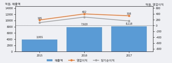 최근 실적을 살펴보면 2017년 매출액이 최근 3년 중 가장 높은 실적을 기록했음을 알 수 있다. 이전 최고 실적이었던 2016년 보다도 2.5%(195억 4천만원) 늘어난 것으로 나타났다.