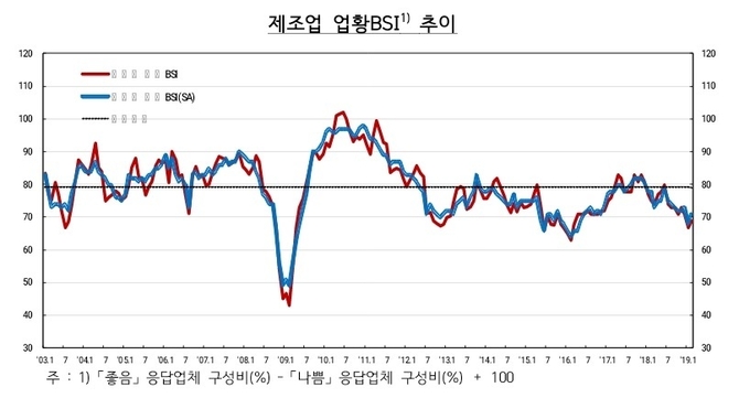 한국은행이 27일 발표한 '2019년 2월 기업경기실사지수(BSI)'를 보면 이달 전체 산업의 업황 BSI는 69로 지난달과 같았다.