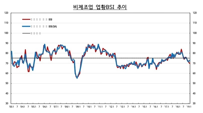 반면 비제조업 업황 BSI는 70으로 1포인트 하락했다. 이는 2016년 7월(70) 이후 2년 7개월 만에 가장 낮은 수준이다.