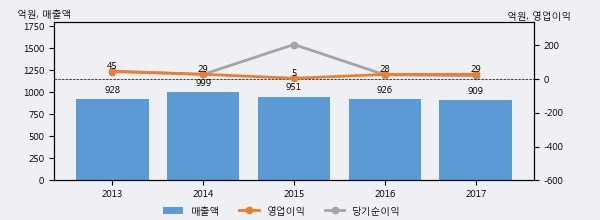 최근 3년간의 실적을 살펴보면, 매출액은 3년 연속 하락하고 있으나 그 하락폭은 줄어들고 있음을 알 수 있다.