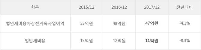고려신용정보의 지난 3년 동안 법인세 납부액 추이를 보면 각각 15억원, 12억원, 11억원으로 매년 감소하고 있다.
