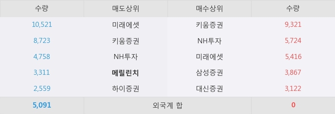 거래원 동향은 메릴린치, 미래에셋, NH투자 등이 매도 상위 목록에 나타나고 있다.