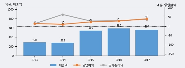 빛샘전자는 2017년 매출액 564억원과 영업이익 40억원을 기록했다. 전년대비 매출은 -3.7% 하락했고, 영업이익은 42.0% 상승했다. 이 회사의 매출액 증감률과 영업이익 증감률은 각각 코스닥 하위 29%, 상위 30%에 해당된다.