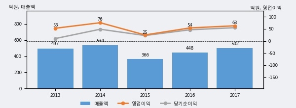 마이크로프랜드의 2017년 매출액은 전년대비 12.1% 늘어난 502억원이고, 영업이익 또한 전년대비 16.5% 늘어난 63억원을 기록했다. 이 회사의 매출액 증감률과 영업이익 증감률은 각각 코스닥 상위 40%, 상위 41%에 해당된다.