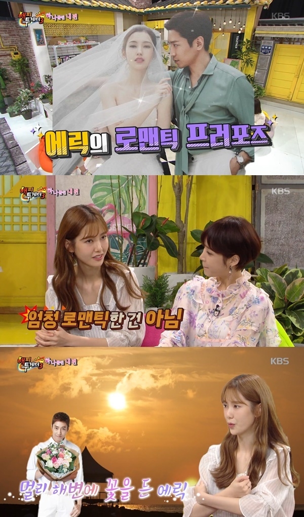 당시 그녀는 "결혼식 전 머리를 식히려 함께 여행을 갔는데 사소한 일로 다투게 됐다. 그때 남편이 말없이 나가버려서 화가 더 났다. 그래서 나도 그냥 자버렸다"라며 "일어나 보니 남편이 나한테 카드 한 장을 줬다. 프러포즈를 받을 느낌이라 얼른 일어나 화장을 하고 흰색 원피스를 입었다. 밖에 나가보니 모래사장에 꽃다발을 든 남편이 있었다"라고 덧붙여 출연진들의 부러움을 샀다.