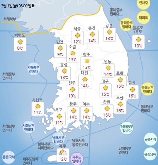 기상청은 1일 "전국 대부분 지역이 맑은 가운데 온도도 올라가며 포근한 날씨가 이어지겠다"고 발표했다.
