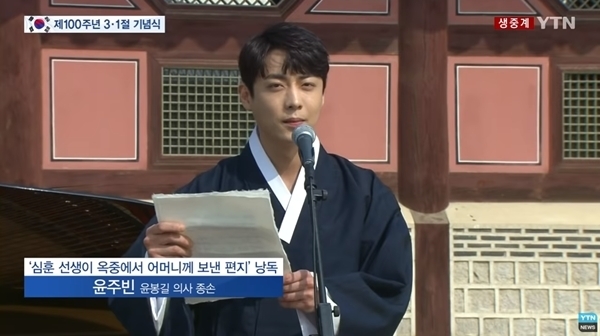 1일 서울 광화문 광장에서 열린 삼일절 100주년 중앙기념식에서는 윤주빈이 독립운동가 심훈이 옥중에서 작성한 편지를 읽어내렸다.