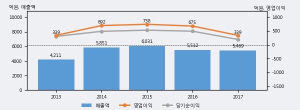 DRB동일의 2017년 매출액은 5469억으로 전년대비 -0.8% 하락했고, 영업이익 역시 339억으로 전년대비 -49.7% 하락했다. 이 회사의 매출액 증감률과 영업이익 증감률은 각각 코스피 하위 26%, 하위 19%에 해당된다.