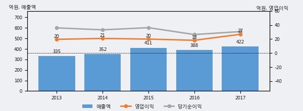 최근 실적을 살펴보면 2017년 매출액이 최근 5년 중 가장 높은 실적을 기록했음을 알 수 있다. 이전 최고 실적이었던 2015년 보다도 2.6%(10억 8천만원) 늘어난 것으로 나타났다.