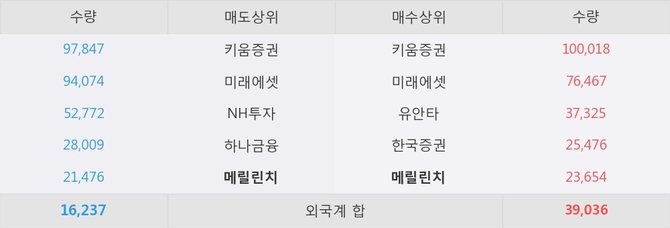 거래원 동향은 메릴린치, 미래에셋이 매수 상위 목록에 나타나고 있다. 한편, 매도 창구 상위에는 메릴린치가 눈에 띄고 있다.