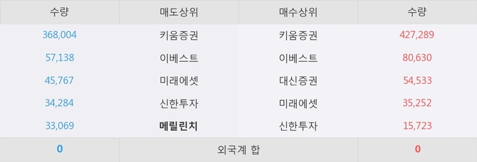 이 시각 주요 거래원은 미래에셋, 키움증권, 이베스트 등이 매수 상위 창구에 자리하고 있다. 한편, 매도 창구 상위에는 메릴린치가 눈에 띄고 있다.