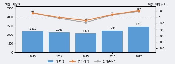 최근 실적을 살펴보면 2017년 매출액이 최근 5년 중 가장 높은 실적을 기록했음을 알 수 있다. 이전 최고 실적이었던 2016년 보다도 16.2%(201억 1천만원) 늘어난 것으로 나타났다.