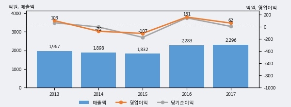 최근 실적을 살펴보면 2017년 매출액이 최근 5년 중 가장 높은 실적을 기록했음을 알 수 있다. 이전 최고 실적이었던 2016년 보다도 0.6%(12억 8천만원) 늘어난 것으로 나타났다.