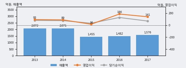 태양의 2017년 매출액은 1576억으로 전년대비 6.4% 상승했고, 영업이익은 141억으로 전년대비 -24.2% 하락했다. 이 회사의 매출액 증감률과 영업이익 증감률은 각각 코스닥 하위 50%, 하위 38%에 해당된다.