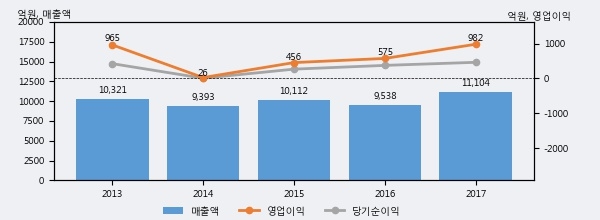 최근 실적을 살펴보면 2017년 매출액이 최근 5년 중 가장 높은 실적을 기록했음을 알 수 있다. 이전 최고 실적이었던 2013년 보다도 7.6%(783억 4천만원) 늘어난 것으로 나타났다.