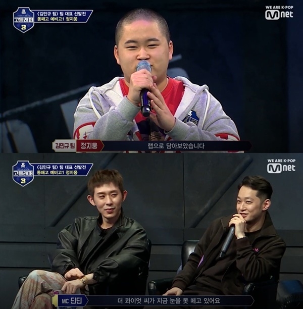 8일 방송된 Mnet '고등래퍼3'에선 정지웅이 10대다운 순수함으로 심사단을 흐뭇하게하는 모습이 그려졌다.