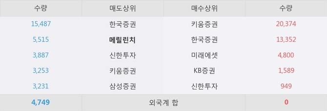 이 시각 주요 거래원은 미래에셋, 키움증권, 한국증권 등이 매수 상위 창구에 자리하고 있다. 한편, 매도 창구 상위에는 메릴린치가 눈에 띄고 있다.