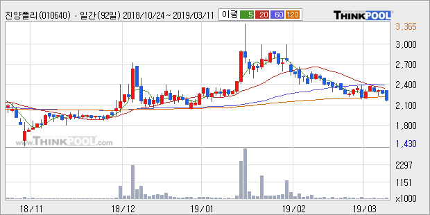 진양폴리는 2017년 매출액 236억원과 영업이익 -8억원을 기록했다. 전년대비 매출은 36.5% 상승했고, 영업이익은 전년에 이어 적자가 지속됐다. 이 회사의 매출액 증감률과 영업이익 증감률은 각각 코스피 상위 9%, 하위 4%에 해당된다.