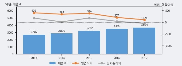 최근 3년간의 실적을 살펴보면 안정적 성장세를 보이고 있다. 최근 3년간 매출로 볼 때 매년 꾸준히 증가하고 있다. 다만 최근에 그 증가폭이 다소 감소하고 있다.