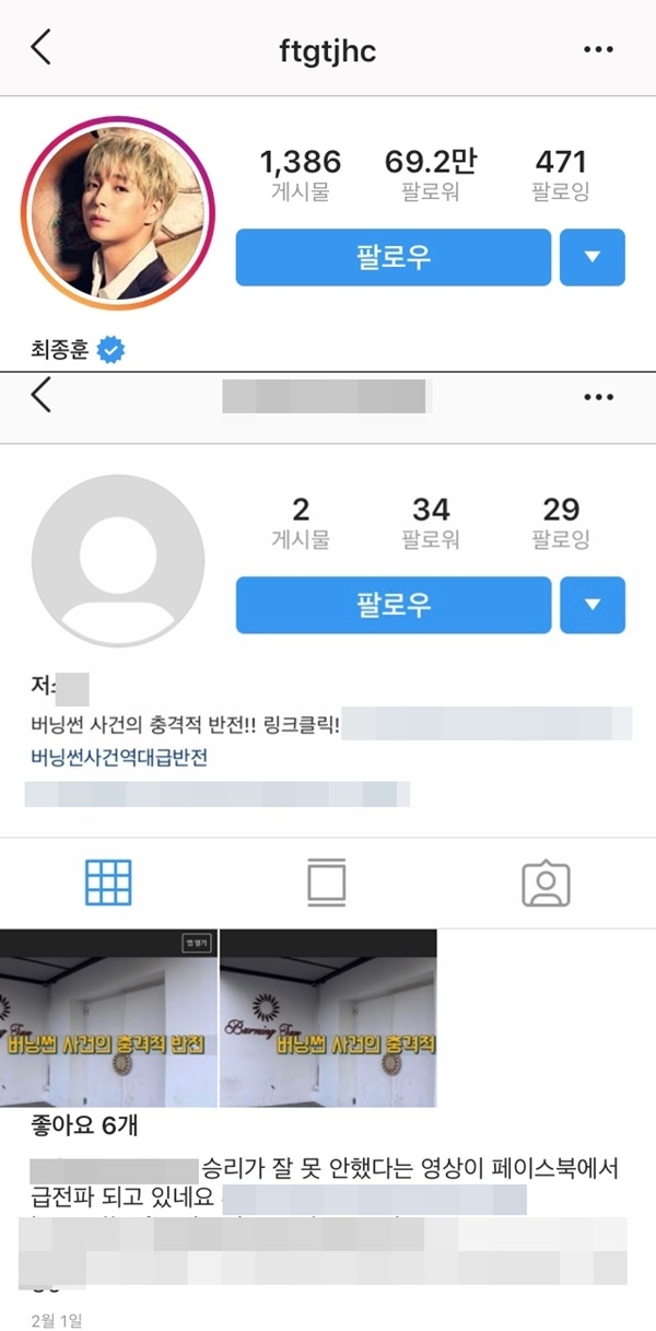 최근 최종훈의 개인 SNS 계정 팔로잉 목록에는 '저OO'이라는 의문의 계정이 포착, 해당 계정엔 앞서 불거진 버닝썬 사건과 관련된 자료들을 업로드하고 있어 눈길을 끌고 있다.