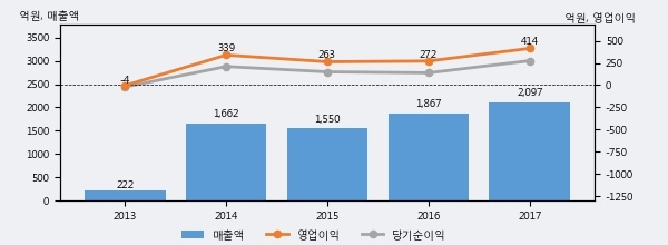 최근 실적을 살펴보면 2017년 매출액이 최근 5년 중 가장 높은 실적을 기록했음을 알 수 있다. 이전 최고 실적이었던 2016년 보다도 12.3%(230억 3천만원) 늘어난 것으로 나타났다.
