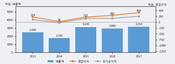 최근 실적을 살펴보면 2017년 매출액이 최근 5년 중 가장 높은 실적을 기록했음을 알 수 있다. 이전 최고 실적이었던 2015년 보다도 0.5%(14억 5천만원) 늘어난 것으로 나타났다.