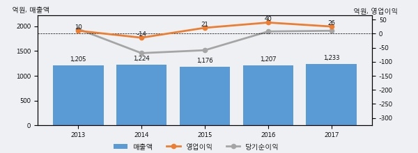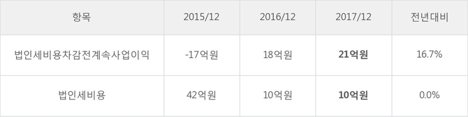 최근 실적을 살펴보면 2017년 매출액이 최근 5년 중 가장 높은 실적을 기록했음을 알 수 있다. 이전 최고 실적이었던 2014년 보다도 0.7%(8억 8천만원) 늘어난 것으로 나타났다.