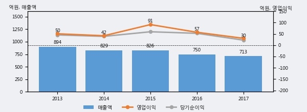 최근 3년간의 실적을 살펴보면, 매출액은 3년 연속 하락하고 있으나 그 하락폭은 줄어들고 있음을 알 수 있다.