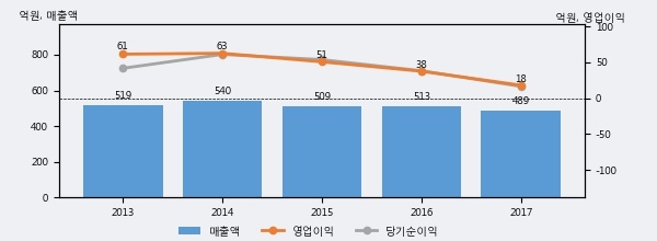 태경화학의 2017년 매출액은 489억으로 전년대비 -4.8% 하락했고, 영업이익 역시 18억으로 전년대비 -52.1% 하락했다. 이 회사의 매출액 증감률과 영업이익 증감률은 각각 코스피 하위 19%, 하위 18%에 해당된다.