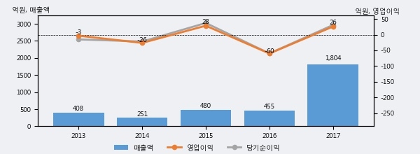 최근 실적을 살펴보면 2017년 매출액이 최근 5년 중 가장 높은 실적을 기록했음을 알 수 있다. 이전 최고 실적이었던 2015년 보다도 276.2%(1324억 7천만원) 늘어난 것으로 나타났다.
