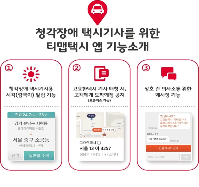 전용 앱은 기존 T맵 택시 앱에 ▲콜 누락 방지를 위한 깜빡이 알림 ▲특이사항 전달을 위한 택시기사-고객 간 메시징 기능 ▲고요한택시 배차 시 알림 기능 등 청각장애 택시기사들의 영업활동에 필요한 기능들이 추가됐다.