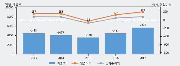 최근 실적을 살펴보면 2017년 매출액이 최근 5년 중 가장 높은 실적을 기록했음을 알 수 있다. 이전 최고 실적이었던 2013년 보다도 26.5%(1179억 2천만원) 늘어난 것으로 나타났다.