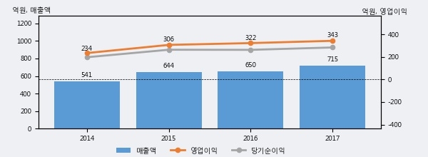 최근 3년간의 실적을 살펴보면 안정적 성장세를 보이고 있다. 최근 3년간 매출로 볼 때 매년 증가하고 있고 그 증가폭도 확대되고 있다.