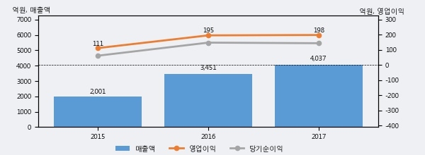 최근 실적을 살펴보면 2017년 매출액이 최근 3년 중 가장 높은 실적을 기록했음을 알 수 있다. 이전 최고 실적이었던 2016년 보다도 17.0%(586억원) 늘어난 것으로 나타났다.