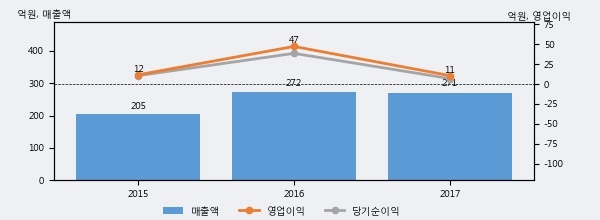 에스엔피월드의 2017년 매출액은 전년대비 -0.1% 줄어든 271억원이고, 영업이익 역시 전년대비 -77.6% 줄어든 11억원을 기록했다. 이 회사의 매출액 증감률과 영업이익 증감률은 각각 코스닥 하위 35%, 하위 21%에 해당된다.