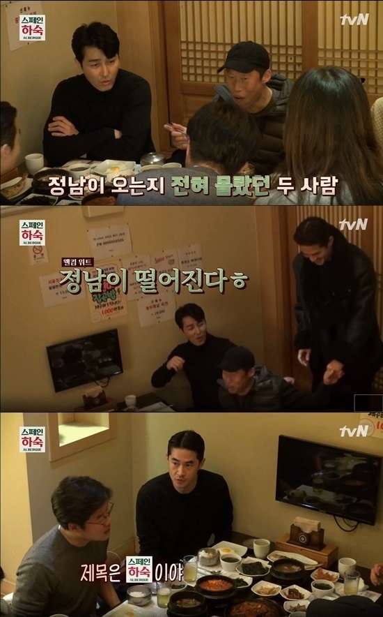그 순간, 배정남이 문을 들고 들어오며 선배 배우 차승원과 유해진에게 인사를 건넸다.