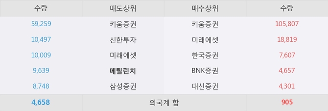 이 시각 주요 거래원은 미래에셋, 키움증권, 한국증권 등이 매수 상위 창구에 자리하고 있다. 한편, 매도 창구 상위에는 메릴린치가 눈에 띄고 있다.