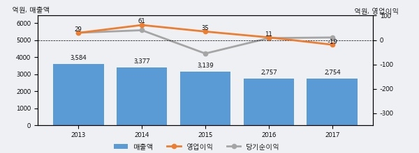 최근 3년간의 실적을 살펴보면, 매출액은 3년 연속 하락하고 있으나 그 하락폭은 줄어들고 있음을 알 수 있다.