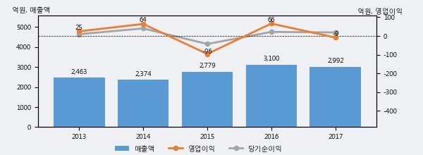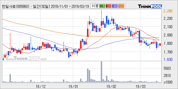 한일사료의 2017년 매출액은 전년대비 -3.5% 줄어든 2992억원이고, 영업이익은 적자전환해서 -9억원을 기록했다. 이 회사의 매출액 증감률과 영업이익 증감률은 각각 코스닥 하위 30%, 하위 16%에 해당된다.