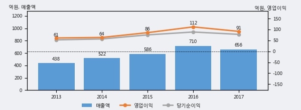 대봉엘에스는 2017년 매출액 656억원과 영업이익 91억원을 기록했다. 전년대비 매출은 -7.6%, 영업이익은 -18.3% 각각 하락했다. 이 회사의 매출액 증감률과 영업이익 증감률은 각각 코스닥 하위 23%, 하위 40%에 해당된다.