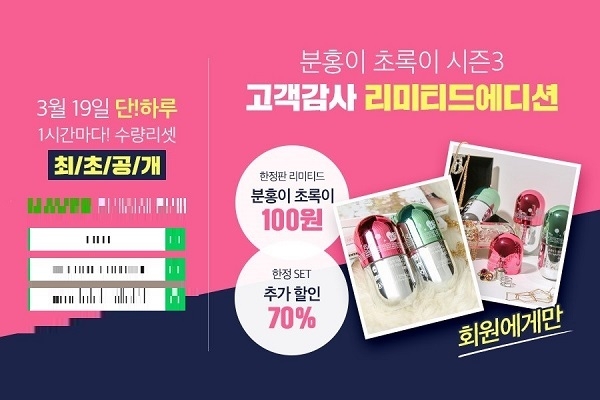 (조세금융신문=이준영 기자)헬스케어 브랜드 GRN(지알엔)의 트레이드마크이자 베스트셀러인 분홍이 초록이 시즌 3 출시에 맞춰 한정판 선착순 100원 이벤트를 진행한다고 19일 전했다. 해당 이벤트는 1시간마다 분홍이 초록이 시즌 3 한정판 시리즈를 각각 150개씩 총 300개가 제공되는 이벤트로 타임딜이기 때문에 매시간 참여가 가능하다.