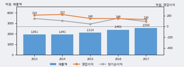 최근 3년간의 실적을 살펴보면 안정적 성장세를 보이고 있다. 최근 3년간 매출로 볼 때 매년 증가하고 있다. 다만 최근에 그 증가폭이 다소 감소하고 있다.