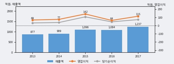 최근 실적을 살펴보면 2017년 매출액이 최근 5년 중 가장 높은 실적을 기록했음을 알 수 있다. 이전 최고 실적이었던 2015년 보다도 12.9%(140억 9천만원) 늘어난 것으로 나타났다.
