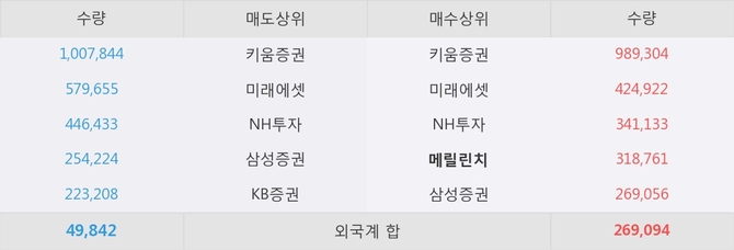 거래원 동향은 메릴린치, 미래에셋, NH투자 등이 매수 상위 목록에 나타나고 있다.