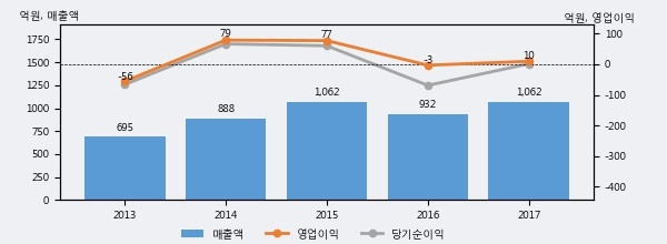 최근 실적을 살펴보면 2017년 매출액이 최근 5년 중 가장 높은 실적을 기록했음을 알 수 있다. 이전 최고 실적이었던 2015년 보다도 0.0%(0원) 늘어난 것으로 나타났다.